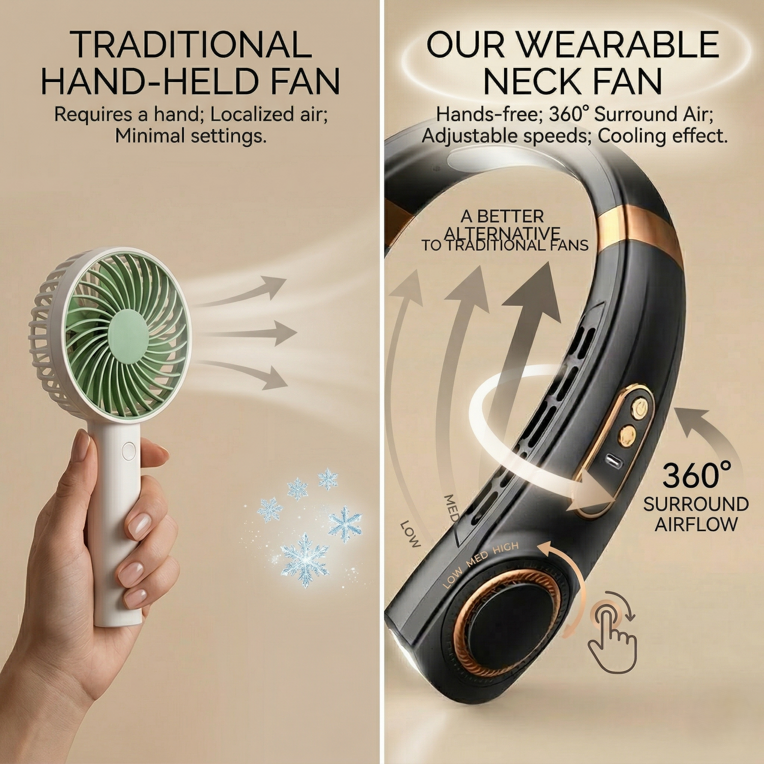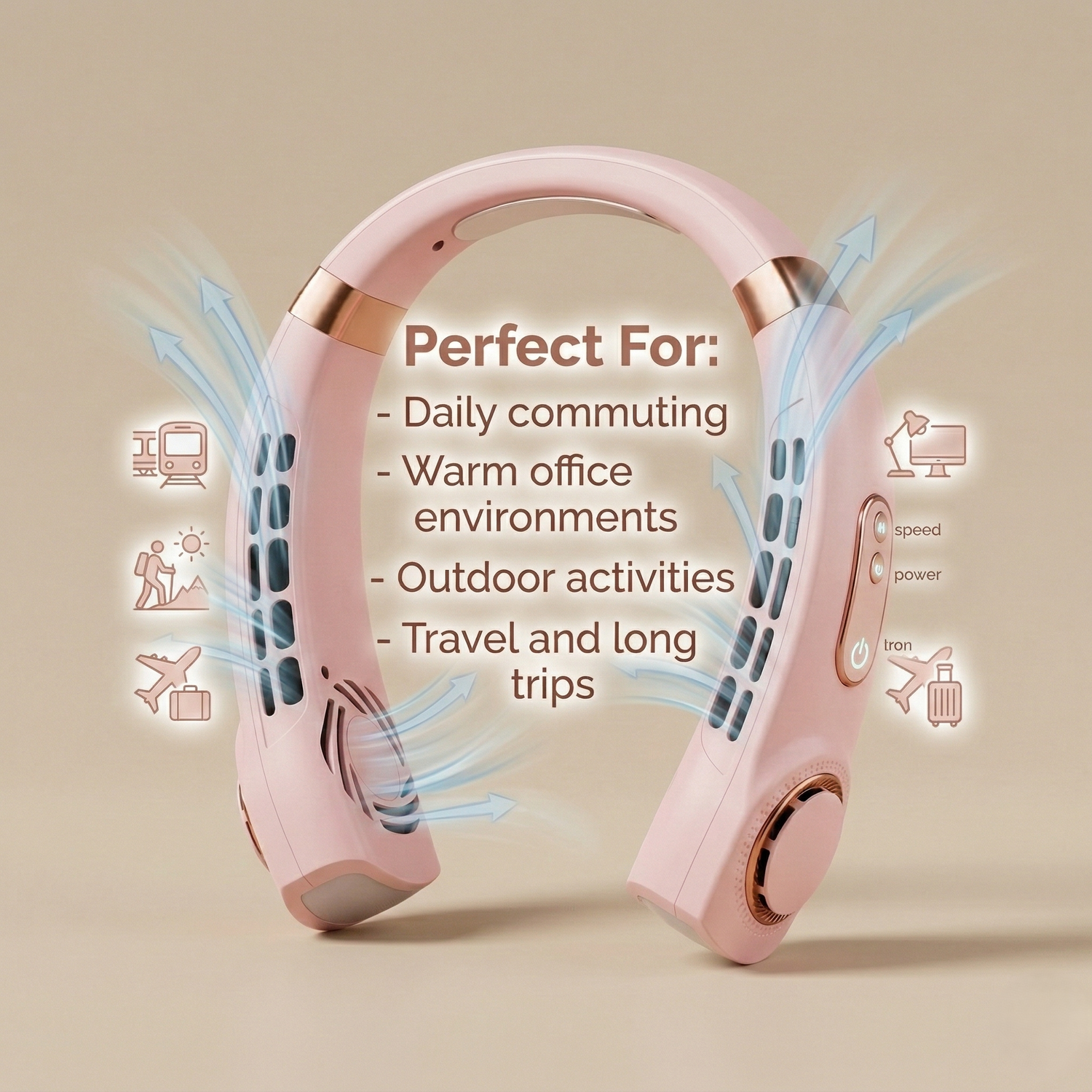 Stay comfortable in warm environments with a wearable cooling solution designed for daily use. Whether you're indoors, commuting, or outdoors, enjoy consistent airflow without needing to hold a device.