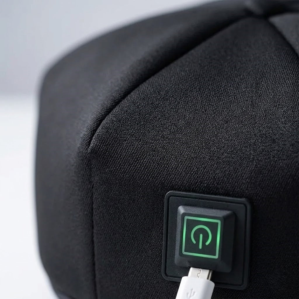 Simply place the hat on your head and turn it on using the control button. You can use it while relaxing, reading, or doing light activities.